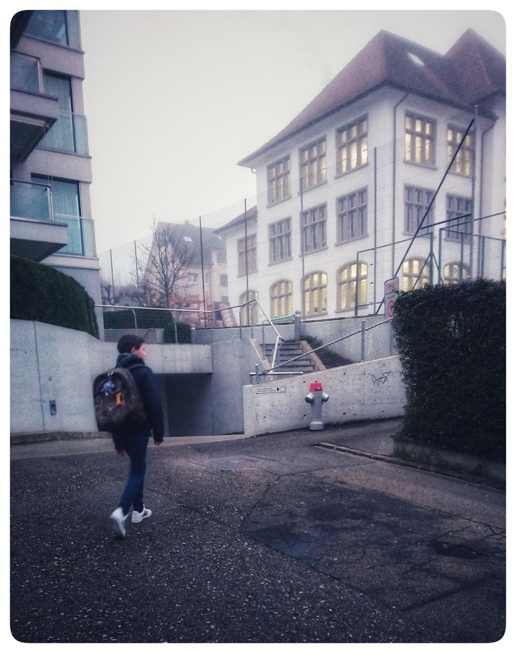Om 12 uur stond ik terug aan het schoolgebouw. Geen enkele andere ouder of grootouder te zien. De Zwitserse kinderen wandelen vanaf kleuterleeftijd zelfstandig van en naar school. Dat was hier duidelijk te zien. Gust kwam buiten samen met 2 andere jongens uit zijn klas en nam afscheid. Onderweg naar huis vertelde hij honderduit over zijn eerste schooldag en alles leek goed te zijn meegevallen.