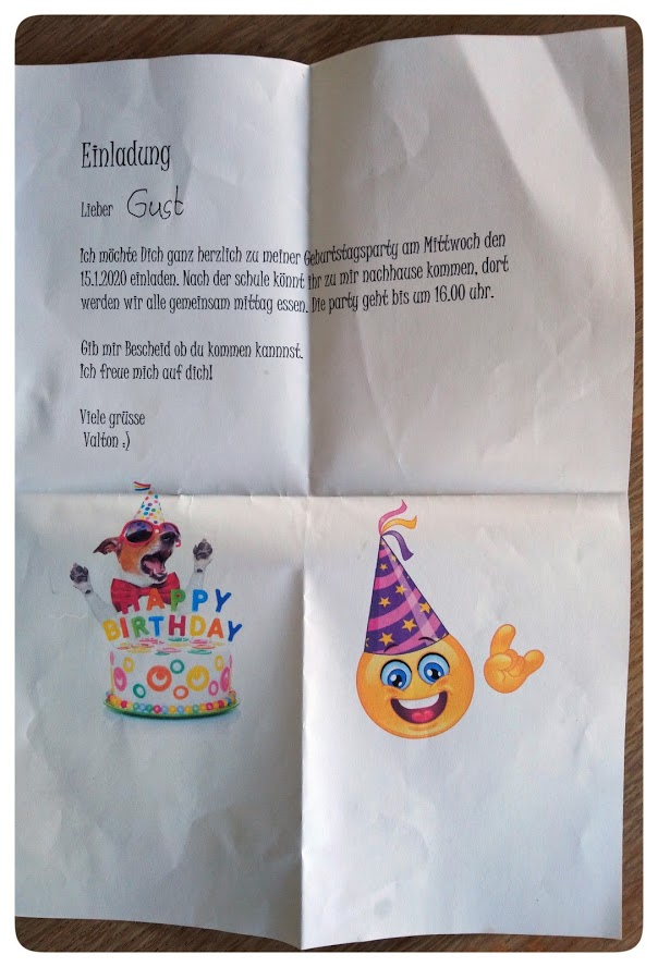 Ohja, en over integratie gesproken. Op donderdagavond kwam Gust thuis met zijn eerste huiswerk en zei hij langs zijn neus weg: ‘Ik heb ook nog een verjaardagsuitnodiging.’ Ik keek even bedenkelijk en even later toverde hij deze uitnodiging uit zijn boekentas. Hoe fijn en warm is dit zeg!