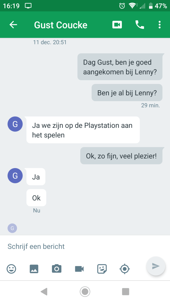 De tijd gaat voorbij en ik merk dat ik na een uurtje toch wel de nood heb om een bericht te sturen. Gewoon om zeker te zijn dat hij goed is aangekomen.