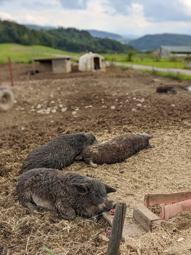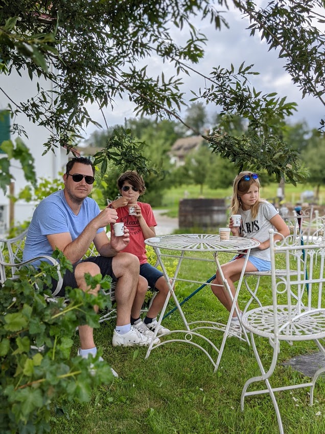 Onderweg kom je voorbij een ‘Hofladen’ (boerderij waar je streekproducenten kan kopen). Daar hielden we even halt en genoten er van een hoeveijsje en de boerderijdieren. Nu weten we waarom het vlees hier in Zwitserland zo duur is. De hoevekippen hebben alvast geen plaatsgebrek.
