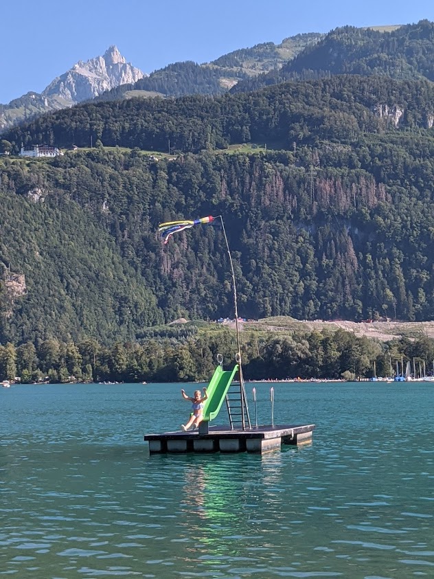 Met nog een halfnatte Julia sprongen we om 16.45 uur terug de boot op maar ons miss had tijdens de heentocht haar oog al laten vallen op een strandje nabij Weesen. Daar lag op het water een vlot met een glijbaan. We beslisten dat we bij deze temperaturen nergens beter konden zijn dan aan of in het water en dus nog de rest van de late namiddag aan het strandje zouden doorbrengen. Plezier verzekerd kan ik jullie vertellen!