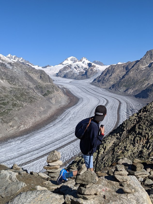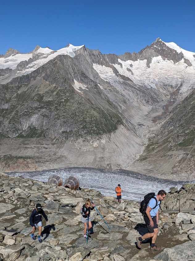 De wandeling start door in Fiescheralp de kabellift te nemen naar Eggishorn. Eggishorn bevindt zich op 2893 meter hoogte. Vanuit Eggishorn kan je de grootste gletsjer van de alpen, de Aletsch Gletsjer, van zeer dichtbij bewonderen. Extra uitleg over de gletsjer op de foto hieronder: