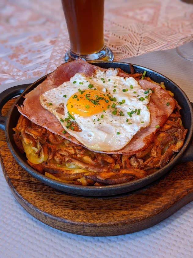 We besloten die avond te eten in het hotel zelf. Terwijl mijn medereizigers voor de Schnitzel mit Pommes und Gemüse gingen, koos ik voor een ander typisch Zwitsers gerecht: Rösti.