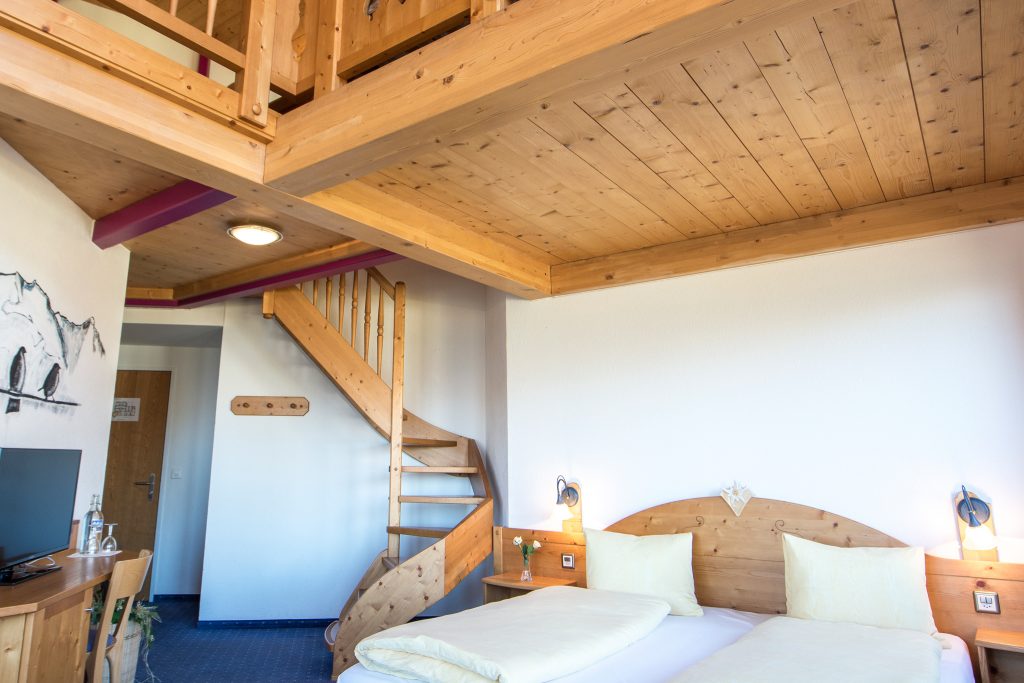 De uitbaatster van het hotel is Zwitsers vriendelijk (er niet meer woorden aan vuil maken dan nodig maar wel alle nodige info verschaffen). We mochten eerst uitpakken voor we de administratieve zaken in orde brachten. Ik had vooraf al wat foto’s van het hotel bekeken met Julia. Ze had een kamer met een mezzanine gezien die ze wel zag zitten dus jullie kunnen haar blik wel voorstellen toen bleek dat we die kamer hadden gekregen.