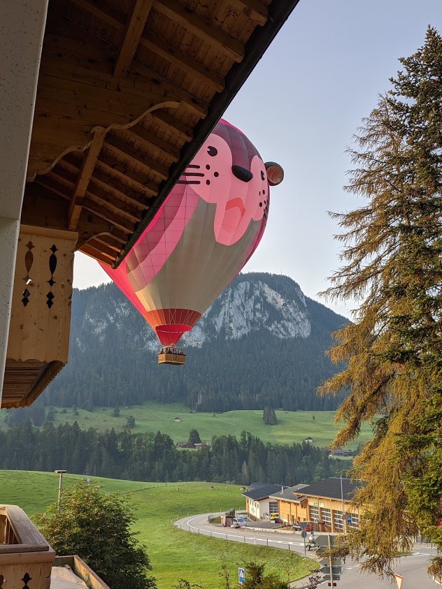 Maar voor we op zondagmorgen vertrokken richting Glacier 3000 werden we in ons hotel op een wel heel speciale manier gewekt. We sliepen met het raam open en opeens hoorden Julia en ik (de mannelijke helft van het gezin lag nog lekker te slapen) een vreemd geluid. We keken uit de ramen maar zagen niks. Waar kwam dat vreemde geluid toch vandaan? Tot we opeens voor onze neus maar liefst 4 luchtballonnen zagen opstijgen. Nog nooit stonden we zo dicht bij een luchtballon. Chateau d’ Oex is dan ook gekend om het ballonvaren en heeft zelfs een ballonmuseum waar je ook de Breitling Orbiter (de eerste ballon die non-stop rond de wereld vloog) kan bezichtingen.