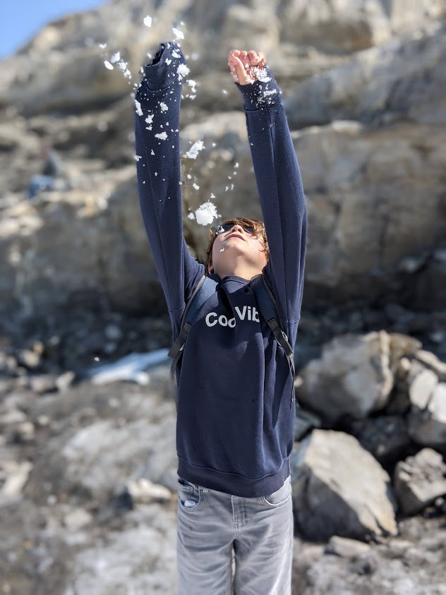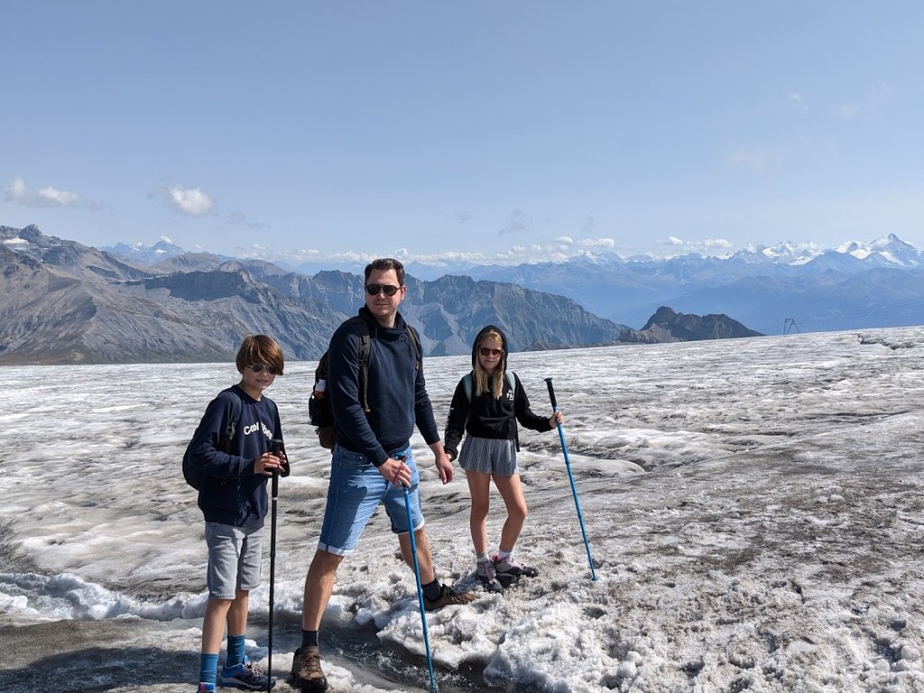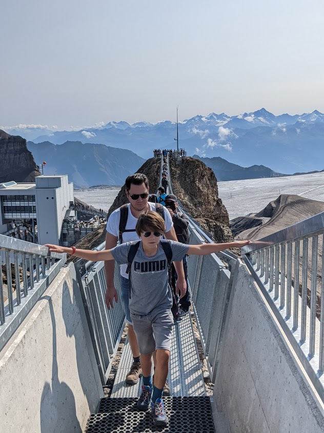 Hoog tijd om aan de gletsjer wandeling te beginnen. Gust en Julia konden niet wachten om met hun voeten in de sneeuw te staan en de sneeuw ook werkelijk aan te raken. Je neemt eerst de Ice Express (een zetellift) naar beneden van waaruit je dan de wandeling ‘Glacier Walk’ kan starten. De wandeling duurt zonder stops een kleine 2 uur. Je wandelt over de gletsjer naar Quille du Diable (2908 m) en terug. Zeker geen zware wandeling maar het stappen in de sneeuw is toch niet te onderschatten. Voorzie zeker waterdichte wandelschoenen.