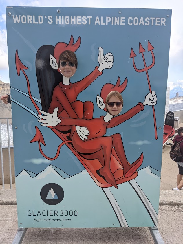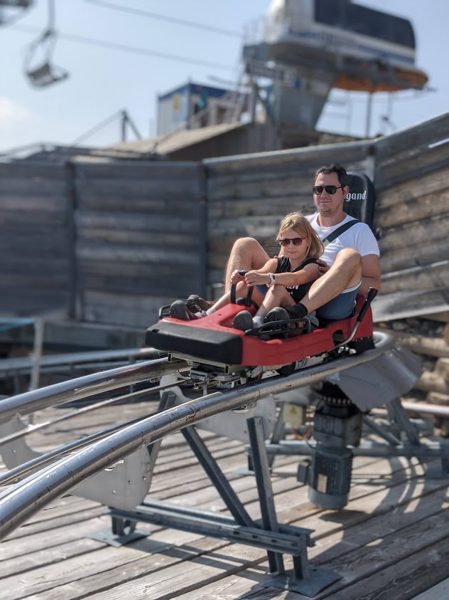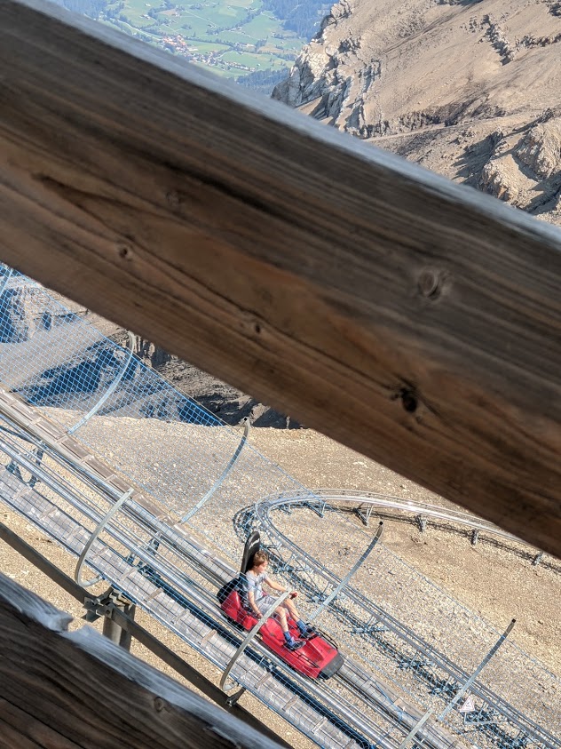 Nadat je vanuit het uitkijkpunt de omgeving hebt verkend, daal je terug naar beneden waar je de hoogste Alpine Coaster van de wereld treft. In volle vaart naar beneden glijden was een grote droom voor mijn Couckjesclan en dus kochten we een ticketje voor Pieter, Gust en Julia. Per ticket betaal je CH9 zelfs al rijd je met 2 samen in 1 karretje. Maar ze hebben er van genoten, gelukkig maar!