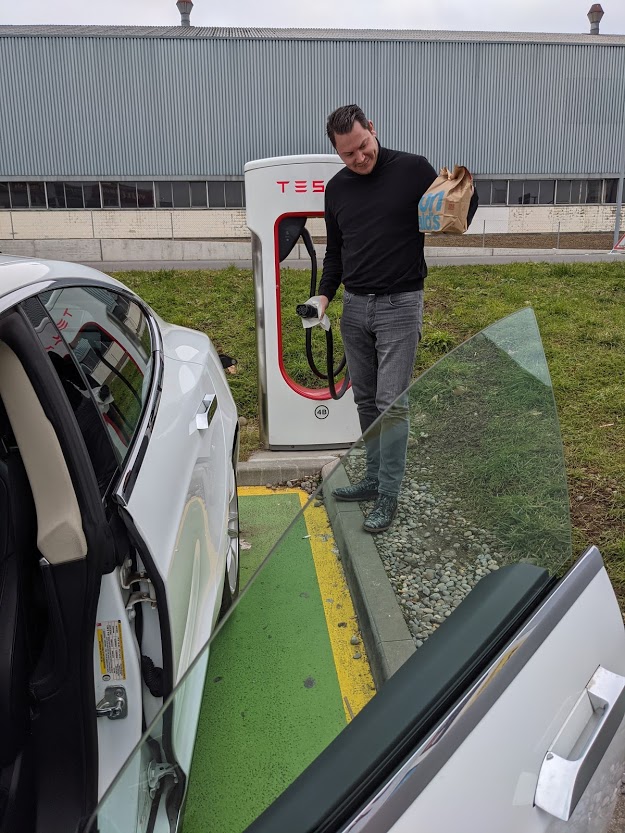 Lekker romantisch zaten we 15 minuten later in de auto aan de Tesla Supercharger te lunchen. Het smaakte, al hadden we een ‘kidsvrij’ dagje toch iets anders gezien.