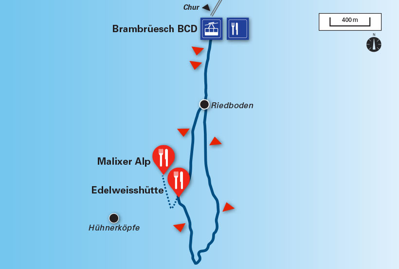 Pieter had vooraf gelezen dat je vanuit Chur ook een kabellift kan nemen naar Brambrüesch en van daaruit een mooie winterwandeling kan maken. De wandeling is een rondweg van 5 kilometer lang met een hoogteverschil van 180 meter. Bij deze dus in te delen onder de noemer ‘lichte wandeling’.