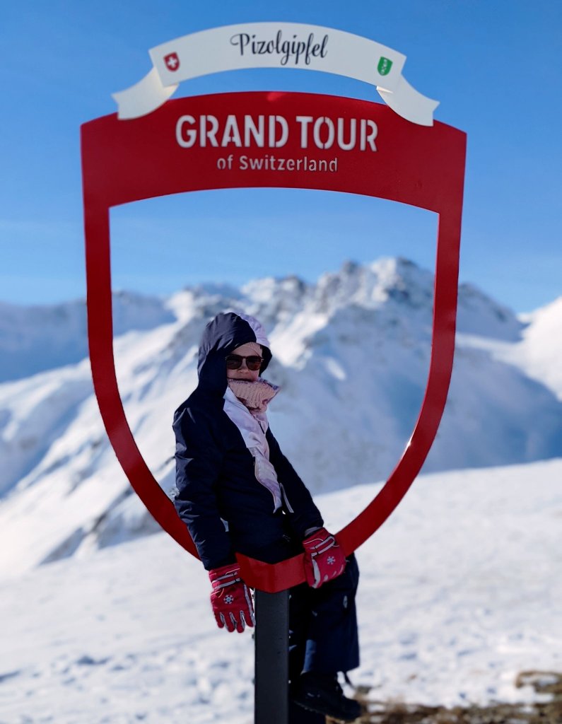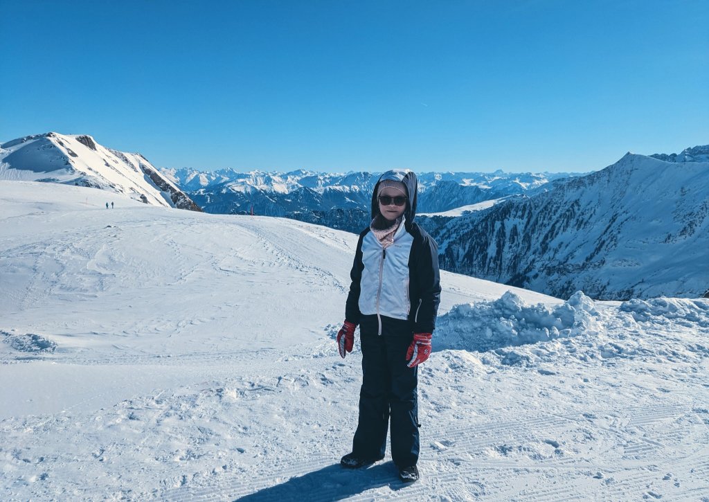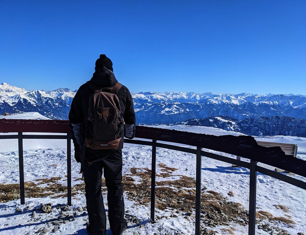 Door de toch wel grote hoogte en het stralende mooie weer vandaag was het uitzicht adembenemend. Je steekt precies wat boven de wereld uit en de witte, besneeuwde toppen zijn betoverend.