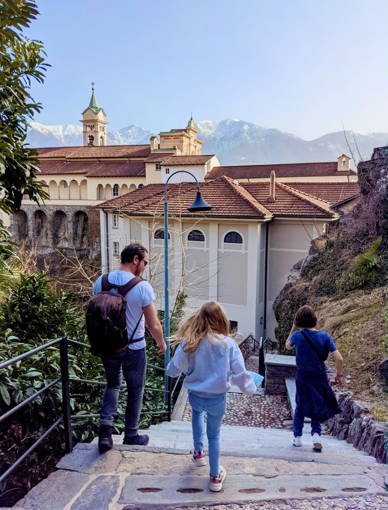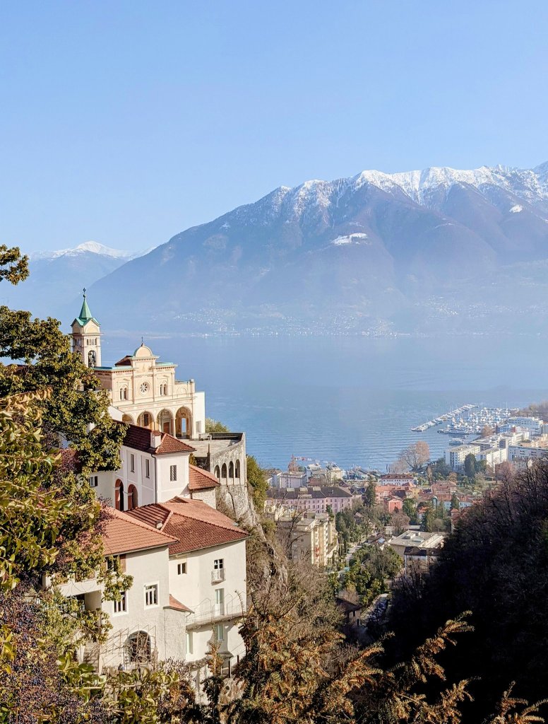 We zetten onze trip verder naar de ‘funecular’ die ons in Orselina naar het beroemdste pelgrimsoord van Italiaans Zwitserland zou brengen: Madonna del Sasso.  In het zonnetje, met uitzicht op de Lago Maggiore, heeft deze kerk wel een zeer idyllische ligging en wordt menig fototoestel door bezoekers uitgehaald (ik beken heel erg schuldig).