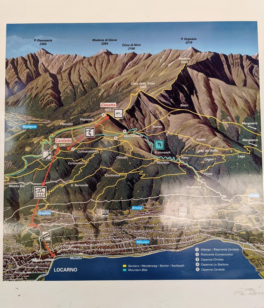 Vanaf de kabellift in Cardada wandel je zo’n 400 meter naar de zetelliftjes die je naar Cimetta (1671m) brengen van waaruit je het hoogste en het laagste punt van Zwitserland kan zien. Het hoogste punt is de Dufourspitze in kanton Walais (De Dufourspitze is met 4634 meter het hoogste punt van Zwitserland en na de Mont Blanc de op één na hoogste berg in de Alpen en in Europa. Wikipedia) en het laagste punt is Brissago aan de Lago Maggiore vlak bij de Italiaanse grens (Brissago, een klein plaatsje aan de grens met Italië, ligt op het laagste punt van Zwitserland, op slechts 197 m boven de zeespiegel, tussen de oevers van het Lago Maggiore en de steile berghellingen. Wikipedia)