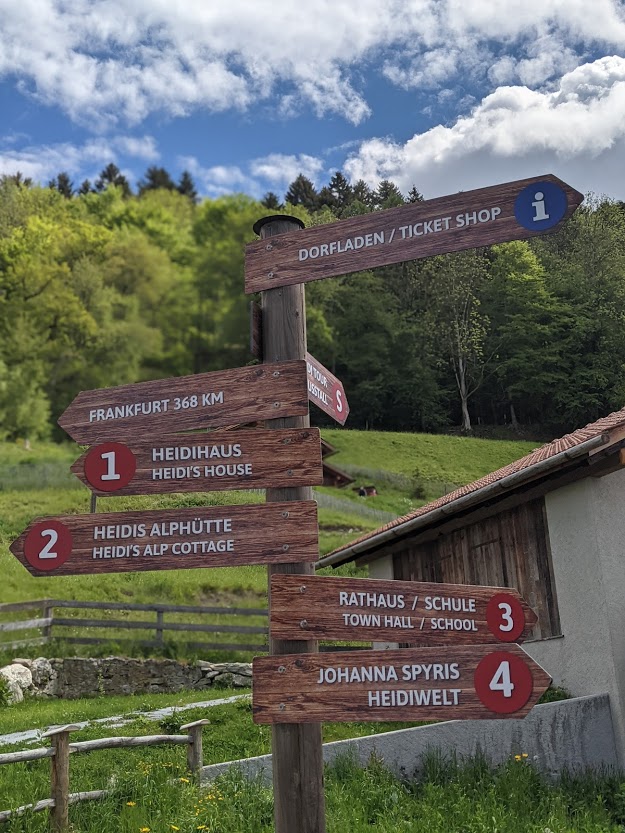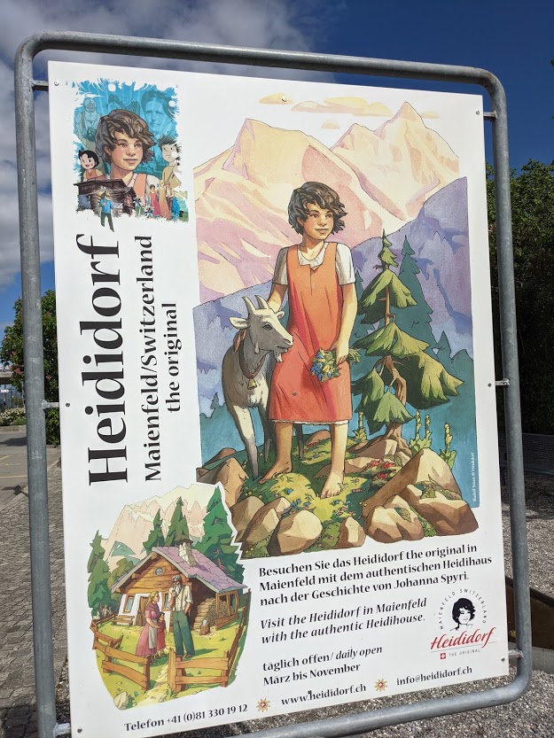 We parkeerden de wagen aan het station van Maienfeld waar we CHF4 betaalden om 24 uur te kunnen parkeren. Recht tegenover het station vind je het eerste Heidi uithangbord en de eerste wegwijzer (rode pijlen) van de Heidiweg.