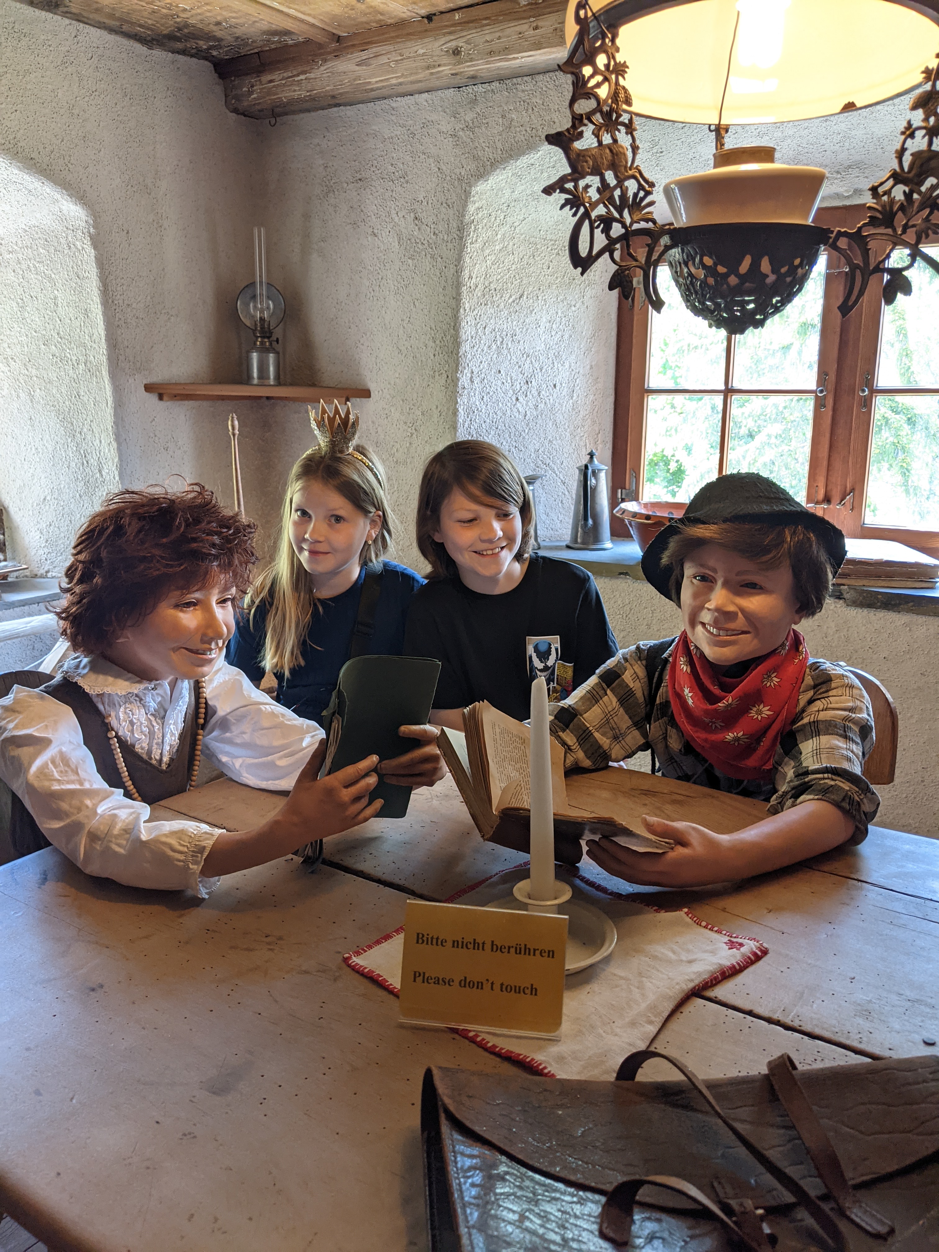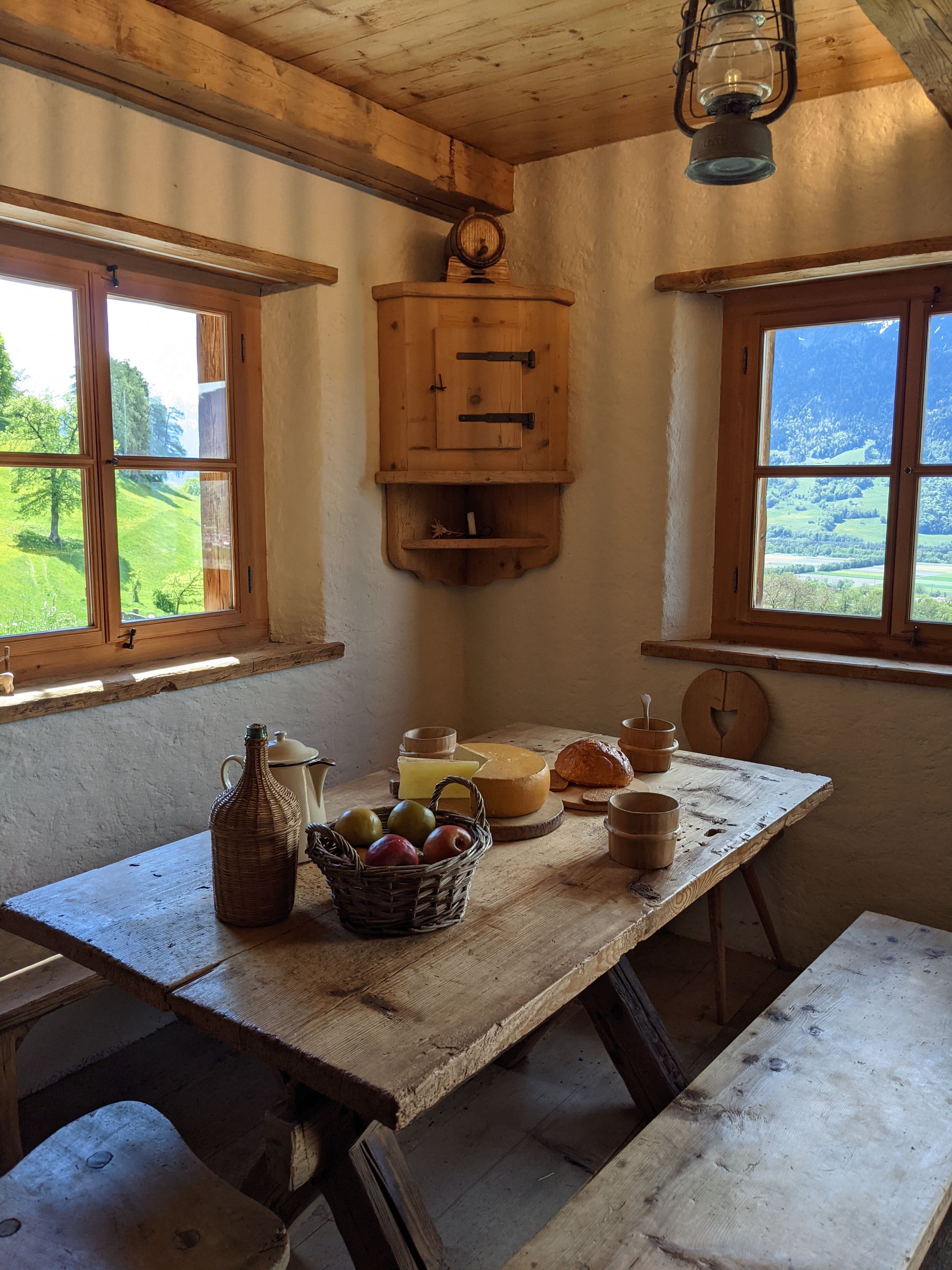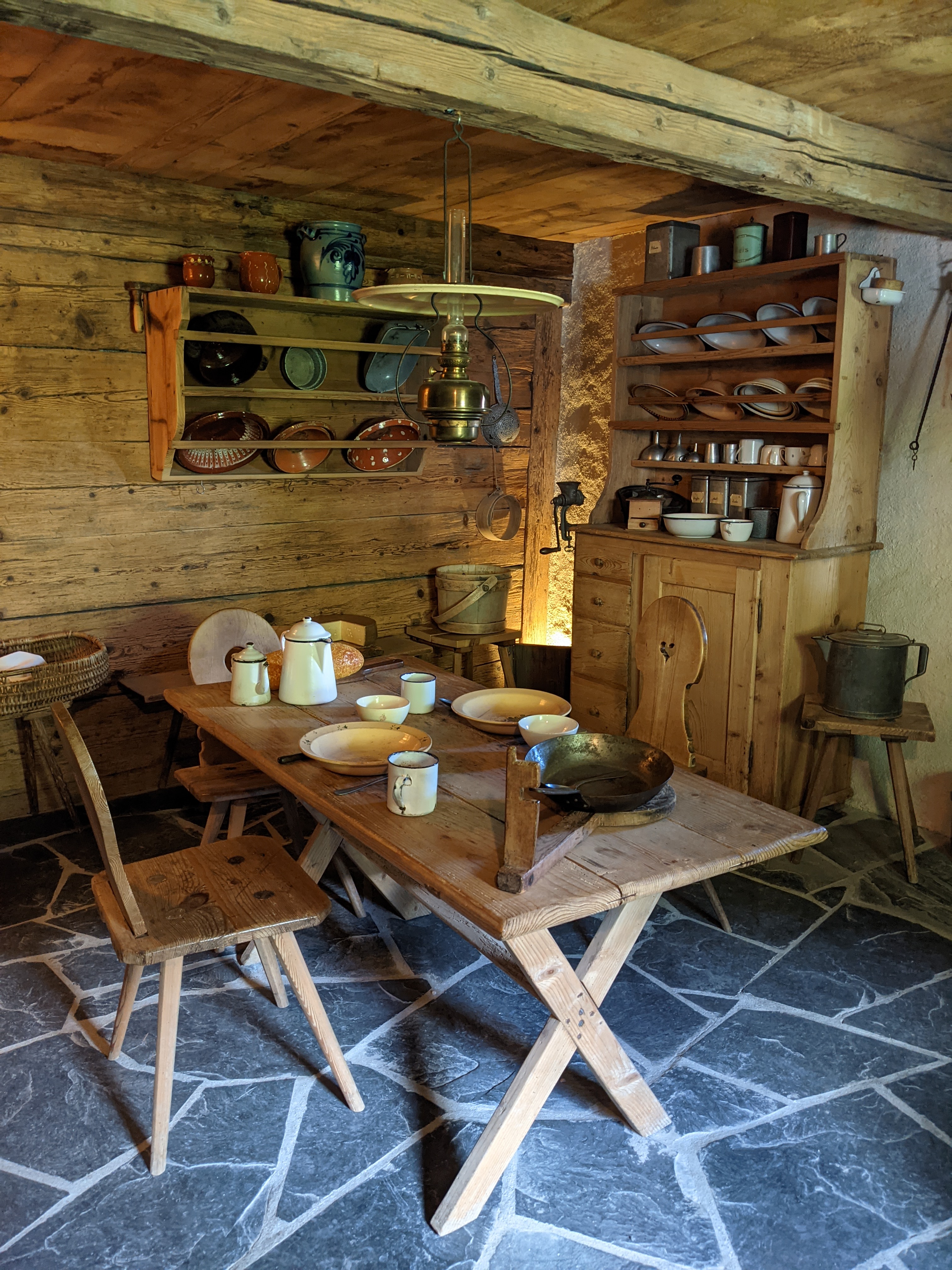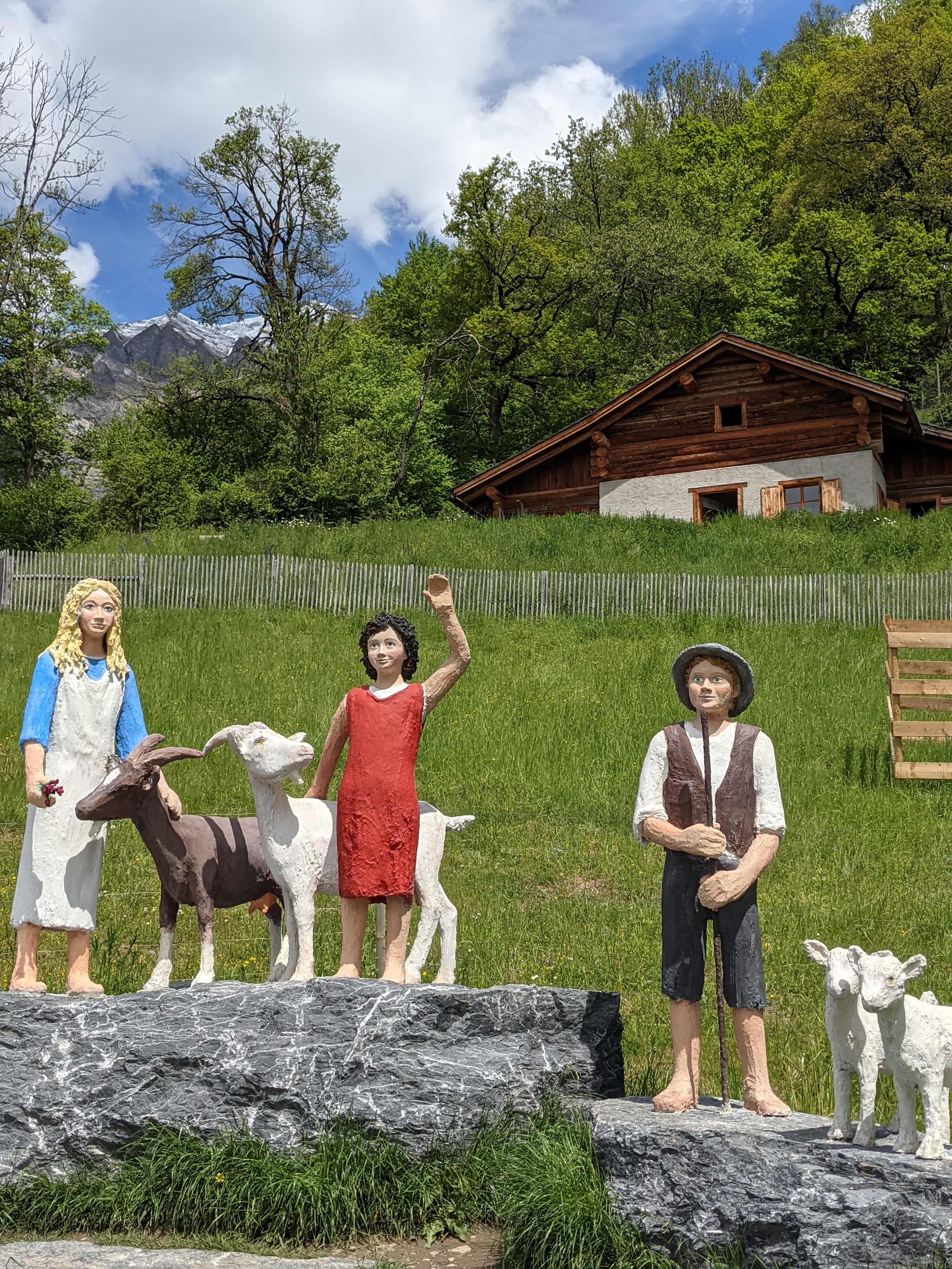 Het voelt een beetje Bokrijk, in het Vlaamse Limburg, aan maar dan veel kleiner uiteraard. De tour start bij de schuur. Daarna ga je naar het winterhuis van grootvader (in het Zwitsers Alpöhi) waar je de verschillende traditioneel ingerichte vertrekken kan bezichtigen. Daarna ga je door naar het hoger gelegen zomeralpenhuis waar Heidi en grootvader tijdens de warmere maanden verbleven tussen de koeien, geiten en schapen. In een review las ik dat het voelt alsof Heidi en Peter net vertrokken zijn uit het huis en dat gevoel klopt ook echt. Heidi haar schoentjes staan nog naast het bed en de keukentafel staat heerlijk gedekt. Het (namaak)brood ligt dan weer af te koelen op een rek op zolder. Na het alpenhuis daal je weer wat waar je het schoolgebouw nog kan bezoeken. Oude schoolbanken, een lei en vergeelde landkaarten toveren je zo terug in de tijd. Buiten kan je nog even naar het geitenpark en om af te sluiten kan je de shop nog eens bezoeken of een postkaartje met Heidistempel van daaruit versturen naar een Heidifan.