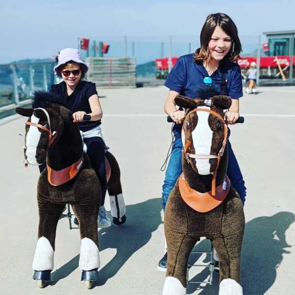 We namen echt onze tijd om vooral te bewonderen en verwonderen. Je wandelt eigenlijk een toertje rond de Zigerberg (2074m) en komt in een rondje terug aan de kabellift in Maschgenkamm. Daar bevindt zich boven de kabelliften een groot terras waar je iets kan drinken of eten. Wij genoten er van een heerlijk koffietje terwijl de kinderen de gratis attractie van de dag uitprobeerden. Nog nooit eerder gezien, maar de fake pony’s leverden niet alleen prachtige plaatjes maar ook heel erg blije gezichtjes op.