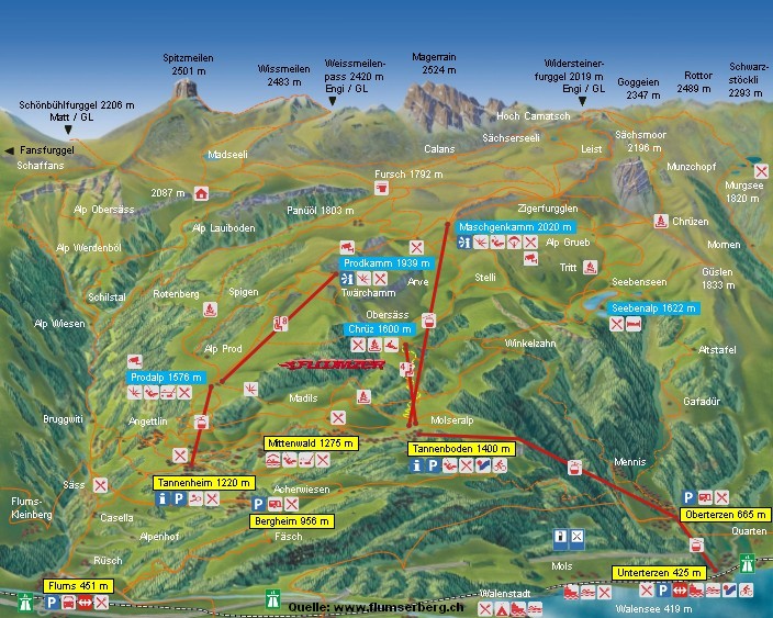 A: Je parkeert de wagen in Unterterzen (425m) en neemt de kabellift naar Tannenboden 1400m) en van Tannenboden de kabellift naar Maschgenkamm (2020m).