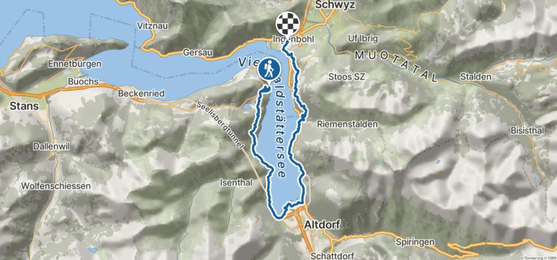 De ‘Weg der Schweiz’ is in totaal 35 kilometer lang, ingedeeld in 4 etappes en loopt volledig langs de Urnersee (uitloper van het Vierwoudstedenmeer). De 4 etappes zijn verschillend van lengte en moeilijkheidsgraad dus beter vooraf goed bekijken. Je kan de volledige tocht bv. als tweedaagse plannen (totaal geschatte duurtijd 10 uur voor ervaren hikers).