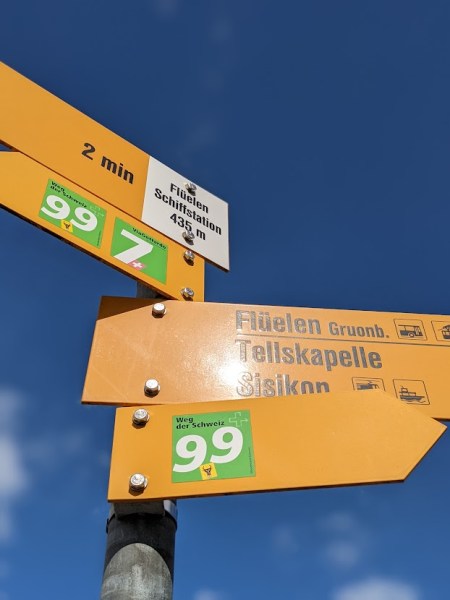 Wij reden vanmorgen van Thalwil naar Flüelen (iets minder dan een uur rijden) waar we de wagen aan het trein- en bootstation (en de start van de wandeling) parkeerden. Van daar volg je de wegwijzers 99 of de gele bordjes richting Sisikon.