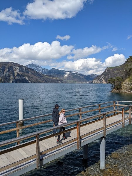 Na de stop (mogelijkheid om naar het toilet te gaan ook hier) wandel je nog een 3,5 km verder langs het meer, houten brugjes en trappen in de rotsen naar de eindbestemming Sisikon. Wij vonden dat laatste stukje het mooiste. Af en toe loop je tijdens deze wandeling langs de straat/tunnel waar auto’s voorbij rijden maar op zich stoort dat niet omdat het uitzicht langs de andere kant zo adembenemend is en het echt maar hele korte stukjes zijn.
