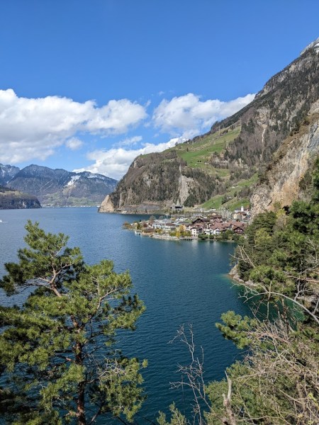 Het eerste stuk wandel je niet meteen naast het water maar op een wandelpad langs de spoorweg en tussen de huizen. Op zich het minst mooie stuk maar het doet alvast verlangen naar meer. Na een 500 meter neem je de eerste trappen en wandel je door bos, natuur en vooral langs de stralend blauwe Urnersee met aan de overkant de magnifieke bergen (nu nog wit vanboven en groen vanonder).