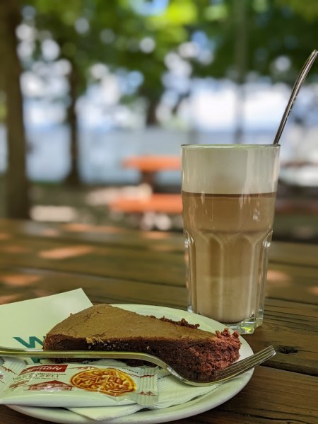 In Richterswil steek je dan een brug over de sporen over waardoor je terug aan het meer en in een park, Richterswil Horn, komt. Ik wandelde door het park met speeltuintje en bar ‘Beizli am See’ waar ik even halt hield voor een heerlijke latte Macchiato met bijhorend stukje chocoladebrownie. Een aanrader, ik kan het weten!