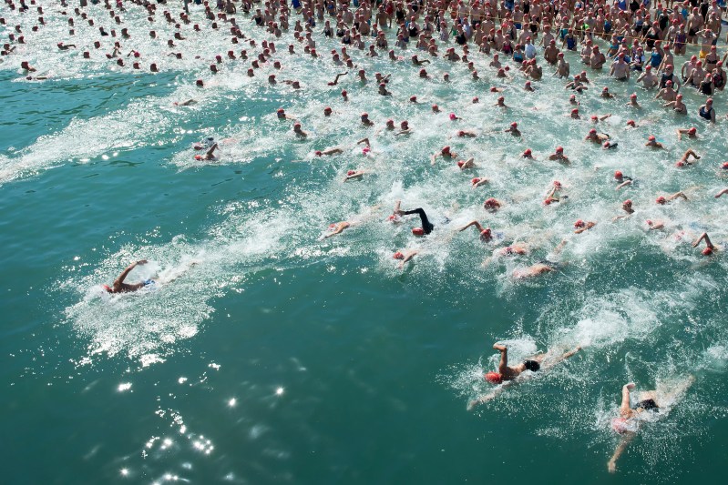 Ik moet zeggen, de organisatie was fantastisch. Je gelooft het misschien niet maar die dag waren er 9000 tickets beschikbaar en dus ook 9000 zotte mensen die het meer zouden overzwemmen. We werden telkens verdeeld in blokken van ongeveer 300 mensen tegelijk. Hopen vrijwilligers, hulpdiensten, informatieborden, pijltjes en ballonnen waartussen we moesten zwemmen. Met een motorboot werd je rugzak met kledij en schoenen naar de overkant gebracht (per letter dus ook) en daar kan je bij aankomst dan alles terugvinden. Ahja, anders sta je aan de overkant van het meer in je zwembroek of badpak wel een beetje gek natuurlijk.