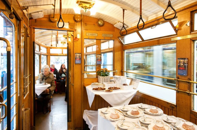 Ik had er al over gelezen en gehoord maar helaas pindakaas ook deze activiteit werd de voorbije jaren on hold gezet. Maar dit jaar rijdt het trammetje gelukkig weer en was ik bij de lucky ones om op tijd tickets te kunnen bestellen. Die tickets zijn niet goedkoop (CHF 20 voor volwassenen en CHF 10 voor kinderen t.e.m. 12 jaar (gelukkig wordt Gust pas binnen 3 dagen 13 jaar 😉)). Dus voor CHF 60 maakten we een tramritje van een halfuur door Zürich terwijl we chocomelk dronken en taart aten maar hey, geef toe, dit moet je toch één keertje hebben gedaan. Alleen al om er een blog te kunnen over schrijven of leuke Instagram foto’s te posten, niet?