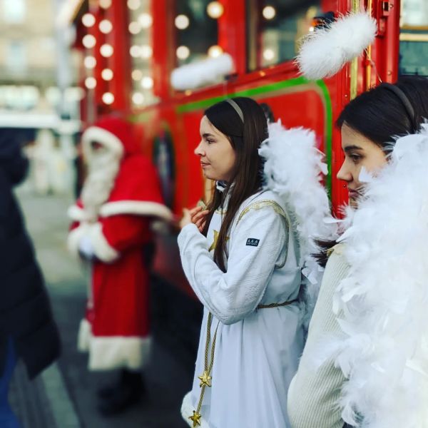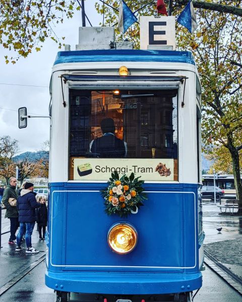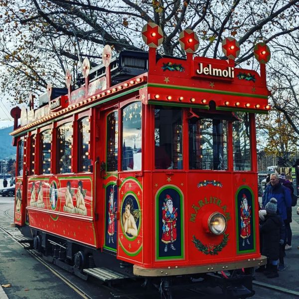 De Märlitram in Zürich waarbij kinderen mogen meerijden met de kerstman en zijn engelen en ondertussen kerstverhalen en liederen mogen aanhoren