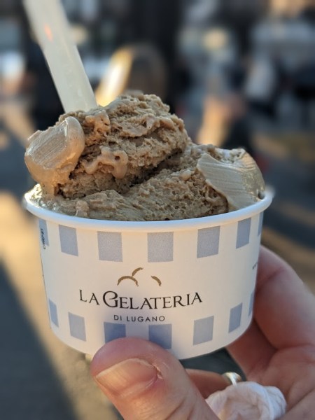 We twijfelden niet lang en zouden de wandeling langs het meer gewoon terug maken. Na het mopperend jong geweld wat op te peppen, ging de wandeling nog vlotter dan het doorgaan en stonden we voor we het wisten terug in park Ciani waar we een echte gelato toch niet konden skippen.