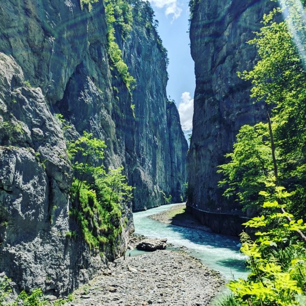 Maar wat is Aareschlucht nu eigenlijk? Dat is een tot 200 meter diepe kloof uitgegraven in de kalkrotsen waartussen je kan wandelen dankzij vlonders en tunnels. De lengte is 1400 m (enkele richting) en het nauwste stuk van de kloof is slechts 1 meter breed. Met de speling van het licht en de zon waan je je ergens in Bali.