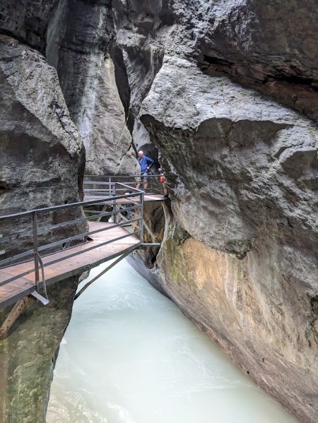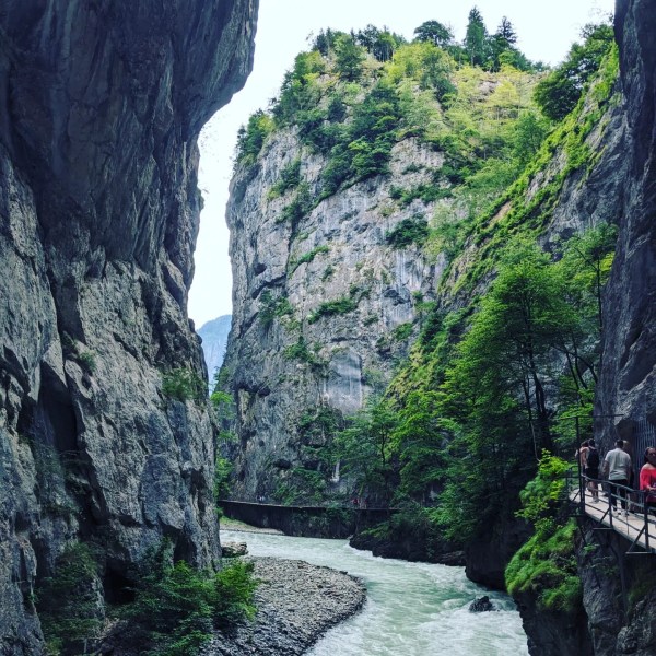 Na het afdalen richting bergstation bewonderden we de waterval nog even van dichtbij en namen we het treintje terug richting dal. Van daaruit is Aareschlucht slechts 5 min. rijden (Aareschluchtstrasse 15, 3860 Schattenhalb). Er zijn helemaal vooraan parking West 2 laadplaatsen voor elektrische wagens. De parking zelf is gratis (ook bij de Reichenbachfälle trouwens). Aareschlucht is een kloof waar het water van de Aare rivier doorheen loopt. Op sommige plaatsen is de kloof zeer smal (<1m) en als je dan het blauw-groene water met wat zon inbeeldt, waan je je al snel in één of ander tropisch vakantieoord.