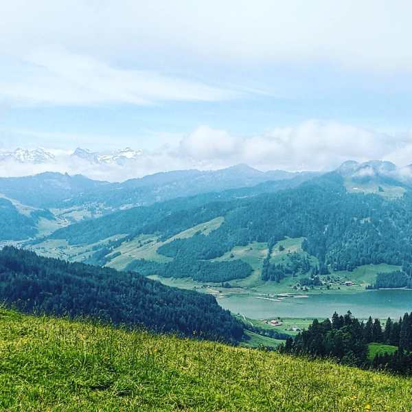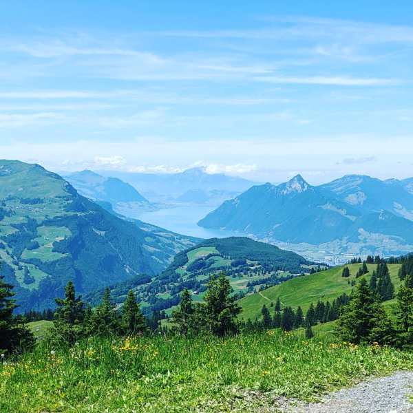 Maar de wandeling dus. Je loopt eigenlijk op een bergkam waardoor je langs beide zijden mooie zichten hebt. Links kijk je over het prachtige Muotathal met in de verte de besneeuwde bergen en rechts kijk je op de groene heuvels en bergen rond Einsiedeln en de Sihlsee. Halverweg de wandeling zie je Lake Lucerne of het Vierwaldstedenmeer ook opduiken.