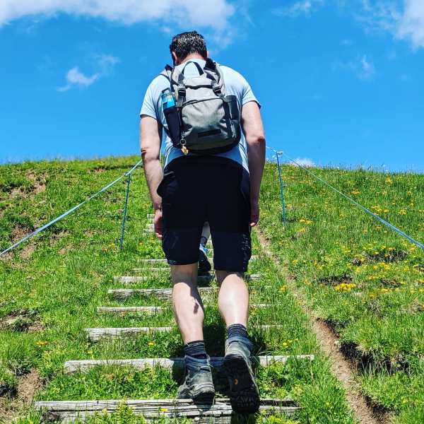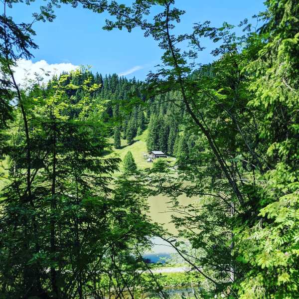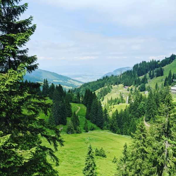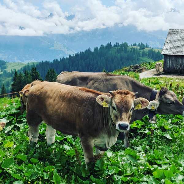 Het eerste stuk van de wandeling tot Wildegg (bereik je na zo’n 3,5 km) is gevarieerd en klimt lichtjes maar doenbaar. Onderweg zie je mooie, groene en heuvelachtige tafereeltjes en hoor je de koebellen vrolijk rinkelen. Net voor je Wildegg bereikt, beklim je nog wat houten trapjes in de groene omgeving. Maar na deze klim kan je heerlijk verpozen op 1 van de eenvoudigste maar misschien wel mooiste terrasjes in de bergen. Het berghutje is enkel tijdens de zomer geopend (opgelet: gesloten op vrijdag dus misschien wel belangrijk bij het plannen van deze trip). Een verfrissend drankje en een bordje gemengd met zo’n prachtig zicht kon ons absoluut bekoren.
