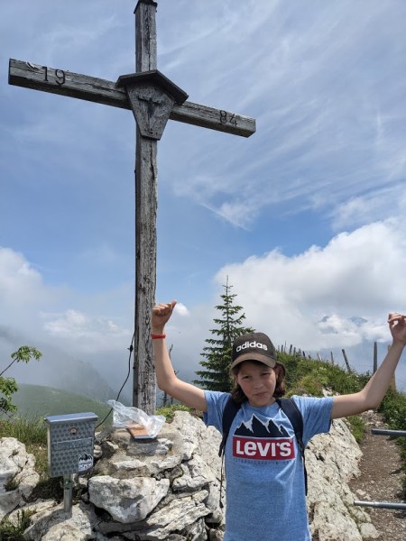 Maar misschien hadden we de beloning moeten sparen tot na de beklimming van de Chli Aubrig berg. Hier ontstond er een kleine miscommunicatie. Ik volgde opnieuw de wandeling die ik vond bij swissfamilyfun maar blijkbaar had ik een stukje niet zo goed begrepen. Ik dacht dat we de Chli Aubrig berg sowieso moesten beklimmen om de wandeling verder te zetten dus konden we beter even halt houden bij het enige berghutje dat je tijdens de wandeling tegenkomt. Gust vloog als een berggeit naar boven, zelf had ik vandaag duidelijk de benen maar Julia vond de klim toch wel stevig. Pieter haalde zijn volledige trucendoos boven om Julia te motiveren en uiteindelijk aan de top van de Chli Aubrig te krijgen. Tot ze boven kwam en ik de pret bederfde met de volgende mededeling: ‘Pieter, Julia, ik moet jullie eigenlijk iets bekennen. Deze klim is blijkbaar optioneel tijdens de wandeling, we moesten dus niet echt naar boven geklommen zijn.’ Julia’s gezicht werd binnen de 3 seconden een donderwolk en ook al is ze er nu al over heen, ik krijg nog steeds een heel erg boze blik wanneer we de anekdote bovenhalen.