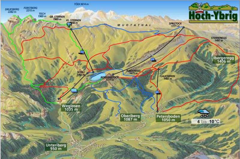Op het kaartje hierboven krijg je een heel duidelijk zicht van de wandeling. Je start in Weglosen op 1035m waar je je wagen parkeerde. Van daaruit neem je de grote kabellift naar Seebli op 1465m hoogte. Deze kabellift vertrekt telkens op het uur en het halfuur. In Seebli aangekomen liepen we meteen door naar de zetelliftjes om te genieten van het uitzicht richting Sternen. In Sternen start de panaromawandeling waarbij je ongeveer een uurtje stapt richting Spirstock. Tijdens de wandeling klim en daal je een klein beetje. Alleen op het laatste, net voor je Spirstock bereikt maak je nog een klim langs een trappenwand. Beetje pittig maar dan heb je ook wel het doel van de dag bereikt.