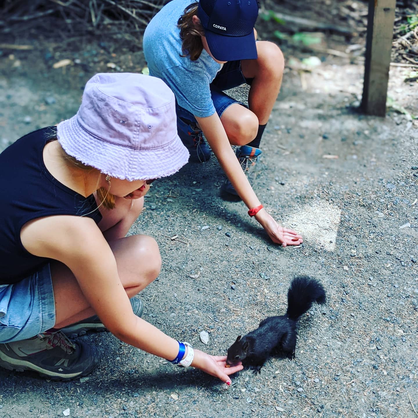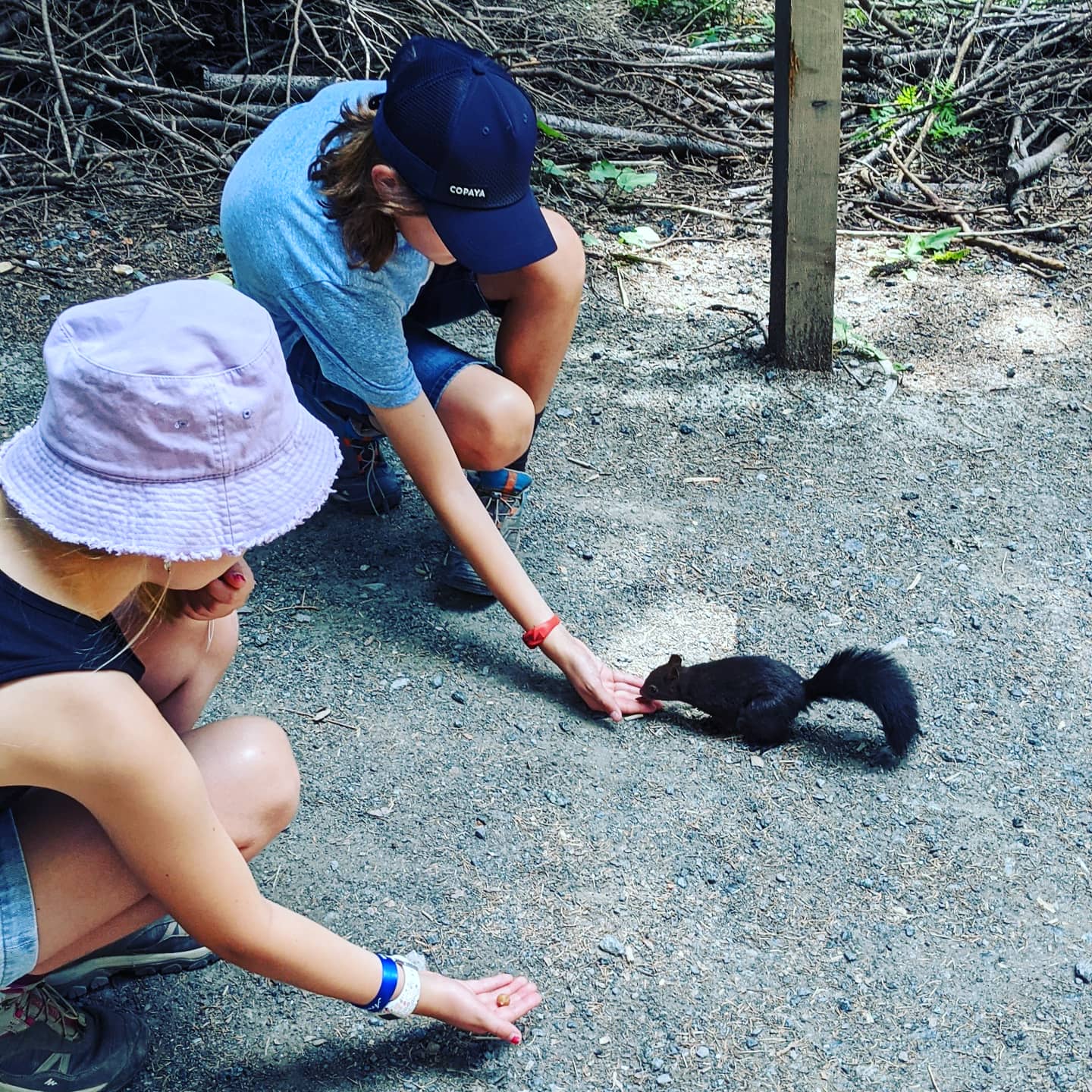 Julia keek al van bij onze aankomst op vrijdag, na een bezoek aan het bureau voor toerisme, uit naar de eekhoorntjeswandeling. Deze korte (2 km enkel) wandeling door de bossen staat reeds aangeduid op de grond in het centrum van Arosa. Vergeet vooraf niet om hazelnoten of walnoten mee te nemen of te kopen in de plaatselijke supermarkt zodat je de eekhoorntjes met de juiste nootjes kan lokken. Ander voedsel is niet aangewezen voor hen. Vanuit het dorp klimt de wandeling licht. Eindpunt is het dorpje Maran waar je eventueel de bus terug kan nemen (voor ouderen of mensen met hele kleine kinderen) of je wandelt lichtjes dalend terug naar het dorp. Wij wandelden heen- en terug want in het bos was het heerlijk koel en het voederen van de eekhoorntjes was veel te plezant. Tip: vertrek behoorlijk vroeg ’s morgens want na wat bezoekers zijn de eekhoorntjes voldaan en komen ze niet meer zo gemakkelijk dichtbij.