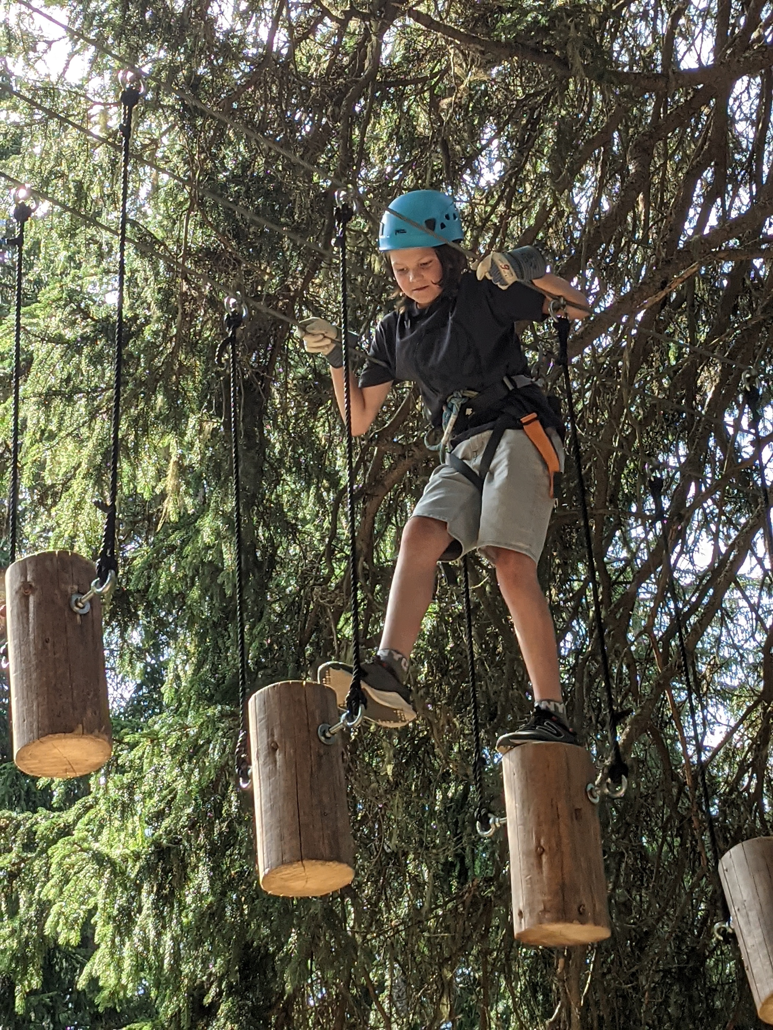 We gingen meteen het dorpje verkennen en kwamen al snel bij het touwenparcours terecht. Gust en Julia droomden hier al langer van maar zo’n activiteiten zijn in Zwitserland vaak heel duur en tijdens corona was zoiets ook gewoon niet mogelijk. Voor CHF 5 per persoon konden Gust en Julia 2 uur klimmen en klauteren (materiaal en inbegrepen). Enige voorwaarde was dat ze onder 12 jaar begeleiding nodig hadden van 1 volwassene. En was ik nu net niet op pad met de ‘verkeerde’ schoenen… Gelukkig was de papa met rugpijn toch zo lief om de bedelende kindertjes te begeleiden. Maar had hij geweten wat hij nu weet, hij had het wellicht niet gedaan. Gust daarentegen sprong als een jong aapje van de ene hindernis naar de andere. En uiteindelijk was het wel een heel mooie teambuilding voor vader en kindertjes.